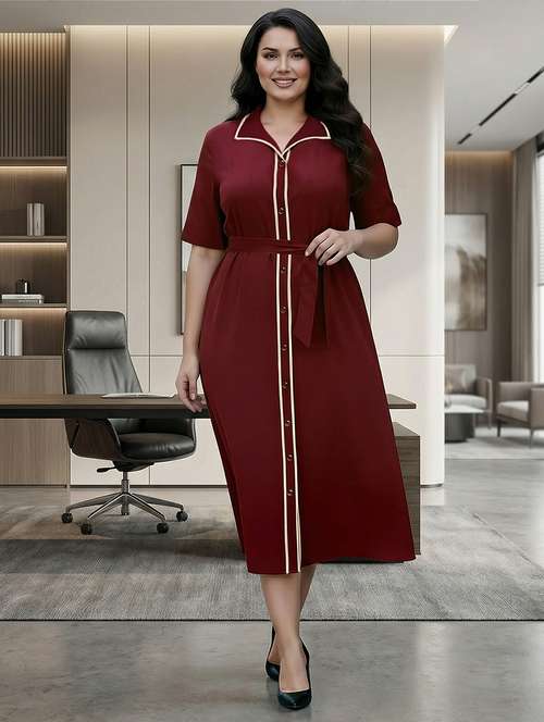 - » globus gloplus women black collared neck short sleeves belted midi plus size shirt style workwear dress