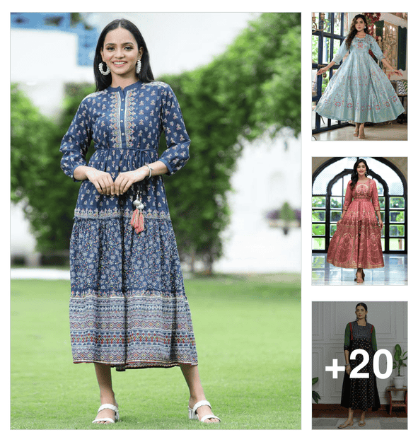 globus women blue ethnic block print mandarin collar flared hem tiered maxi fusion dress