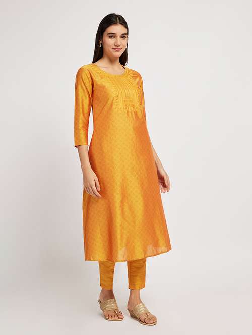 - Grab this beautiful kurta made up of silk fabric featuring round neck designs.